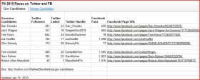 Found this on Twitter last night. It is a spreadsheet snapshot of how the candidates in these two races are using Twitter and Facebook AND how effectively they are using it. Corbett is kicking ass. He has the second highest number of Tweeps (400) and the second highest number of Facebook fans (1,565). The leading […]