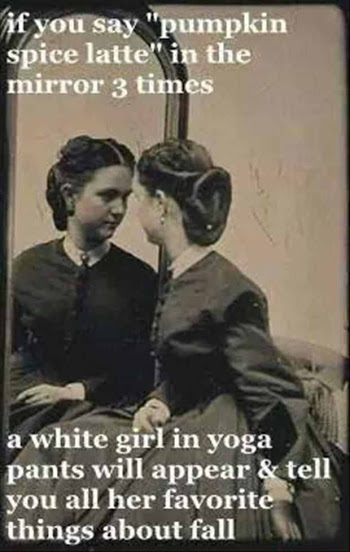 Admittedly, I prefer the Starbucks PSL, but I also really like the Crazy Mocha version. And I always appreciate a good jab at pretentious white folks, but the white girls association with PSL has me in hysterics. I love everything about it from the scarf to the boots to the “messy bun.” We’ve been frequenting the Starbucks in Ross Township of late (it is near our pharmacy) and it is filled to the brim with northern suburban white Catholic kids. To the brim. Lots and lots of flip flops with winter gear. And oversized scarves. It makes me laugh every time.