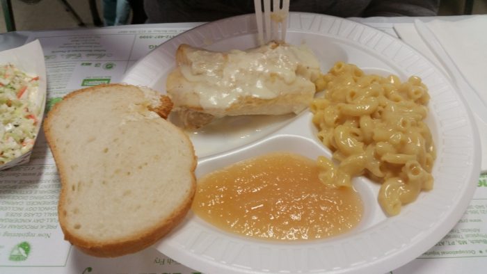 I have to give this group of folks two thumbs up for their infrastructure and organization. They had signage, ropes, people pointing the right line, name tags, the servers even had aprons embroidered with their first names. They were efficient, friendly and courteous. In two shakes of a lambs tail, I was giving my order to Mary Ellen. Laura didn’t want the complimentary soup so Mary Ellen insisted on giving her an extra side dish.