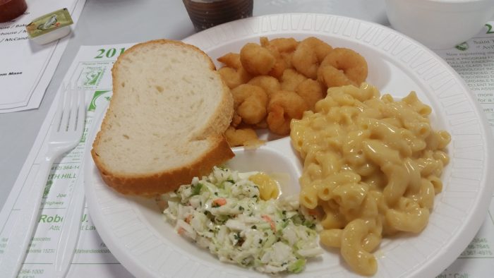 The menu was pretty typical – adult meals with a fish entree (fried, baked or friend shrimp), a soup and choice of two sides, plus bread and 12 ounce cup of a beverage. No pierogies. And they ran out of haluski before we arrived. Also, they served beer and wine by donation which is a bit atypical.