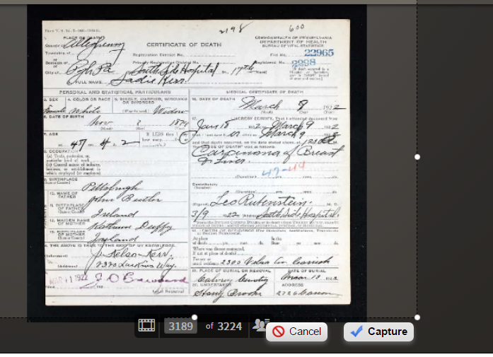 Start at the top – Sadie was in the South Side Hospital from January 19 to March 9, 1922. Her home address was Carrick. Her diagnosis was cancer of both breast and liver. No clue to how long she lived with those, but her level of activity suggests it was either not a deterrent or she was a tough broad. Very tough. No entry under occupation, not even housewife or domestic. She kept body and soul together for a long time on her own as a single mother, but that’s not acknowledged.