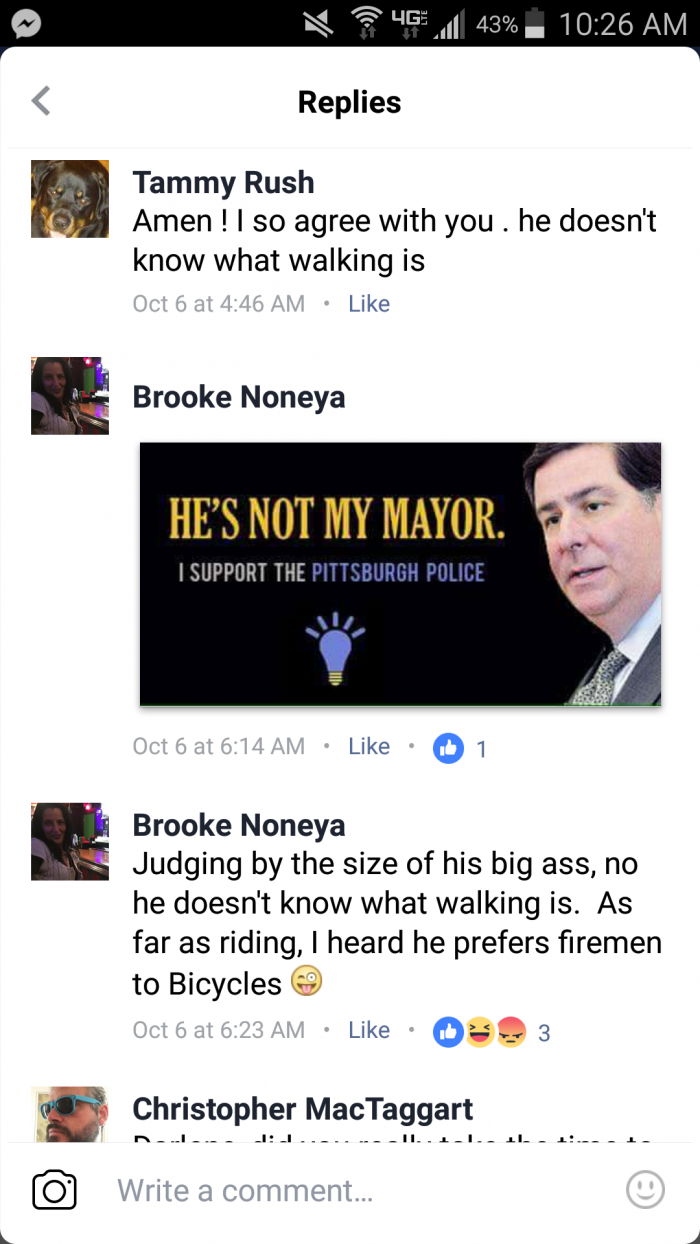 A Darlene supporter named Brooke Noneya posted a meme stating that Bill Peduto is not her Mayor (because?) she supports the Pittsburgh Police. She then added