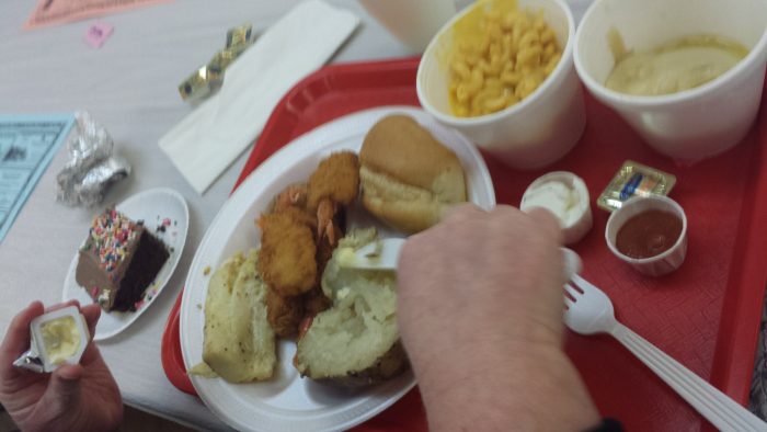 Our drink choices were iced tea, lemonade, and water. I do not know why every fish fry has such blah lemonade, but it is pretty consistent. Is there a universal church lemonade powder that is lackluster by design? But it wasn’t awful and I was definitely thirsty. And wine in a plastic pitcher is just a little too mommy-wine-culture for me.