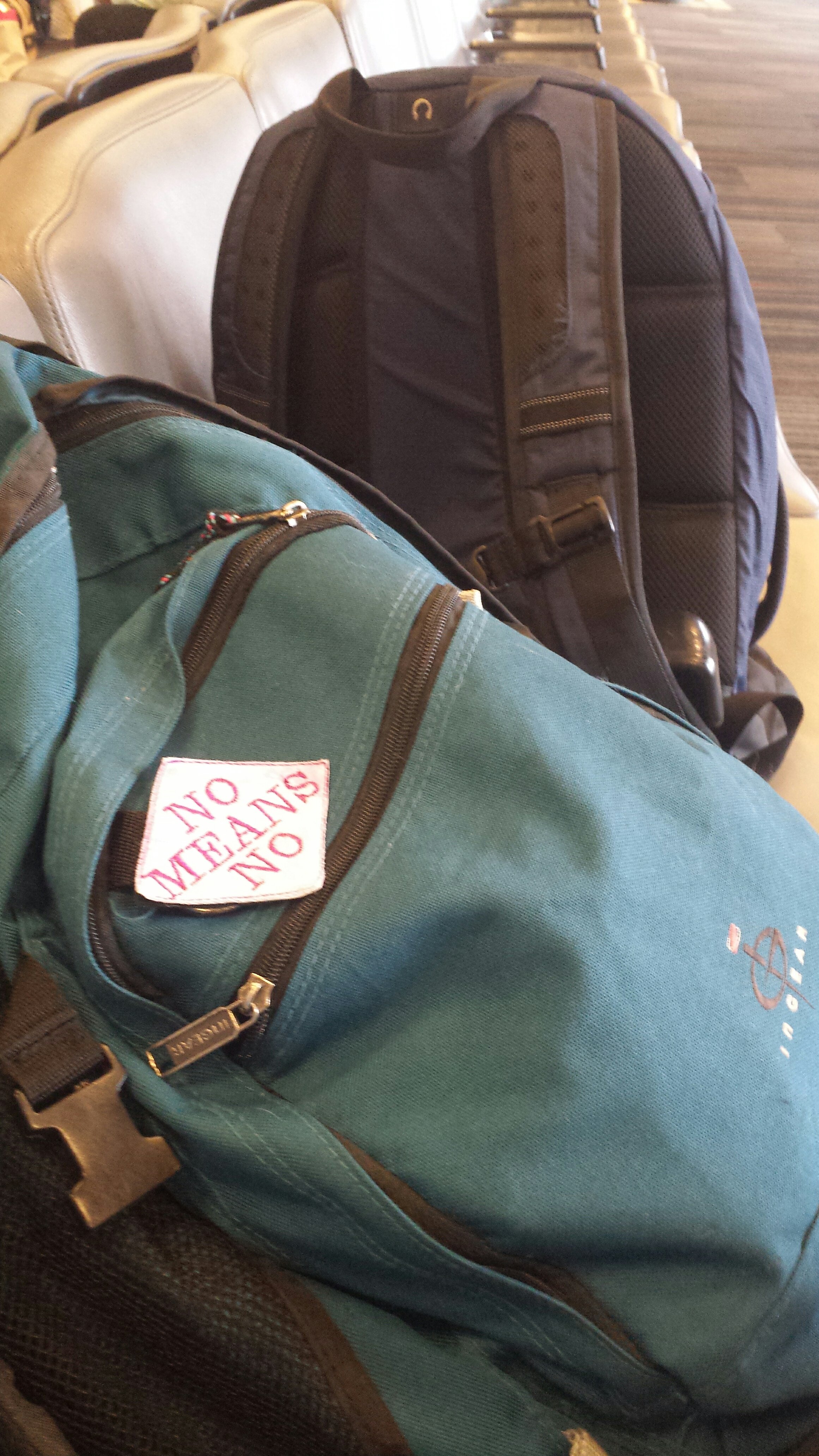 I’ve used my share of pins on this bag. They were all removed for a wash. I started this trip fresh with a pin from HMR Apparel’s feminist line No Means No.