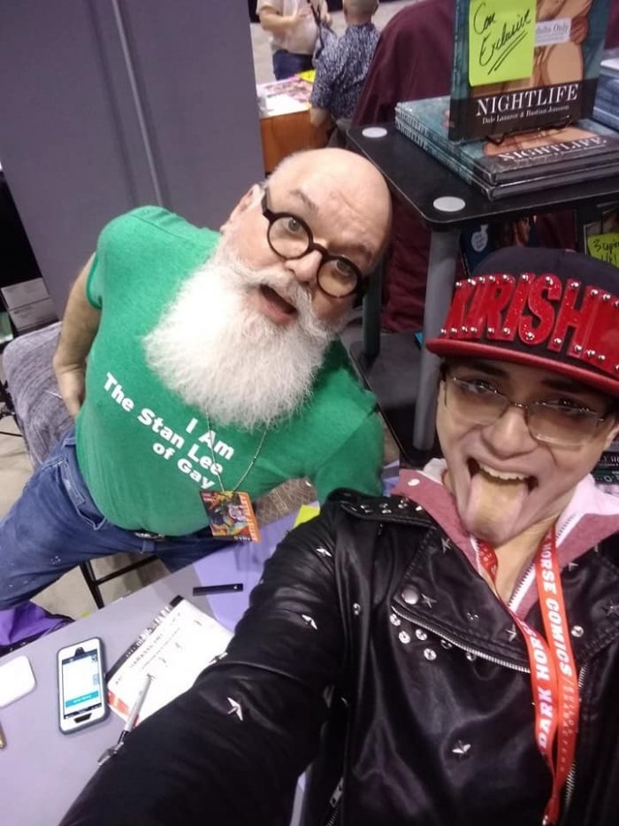 Tell us about your moniker “The Stan Lee of Gay”. One day, I posted on Facebook that I have a hard time explaining what I do — write and art direct sex-positive, gay character-based erotic comics in art book hardcover format — to people in comic cons who don’t understand how comics work and then ask me if I draw the comics or do commission art. A fan described me as “The Stan Lee of Gay Comics” because, in his estimate, my collaborators and I have reinvented gay erotic comics the way Stan Lee and his collaborators reinvented superhero comics in 1962. I responded: that’s a t-shirt! I shortened his descriptor to “The Stan Lee of Gay” because it’s funnier and catchier. If people ask what “The Stan Lee of Gay” means, I say, “I am like Stan Lee because he can’t draw Spider-Man but he writes him really well.” And they laugh. And the t-shirt actually sells books for us!