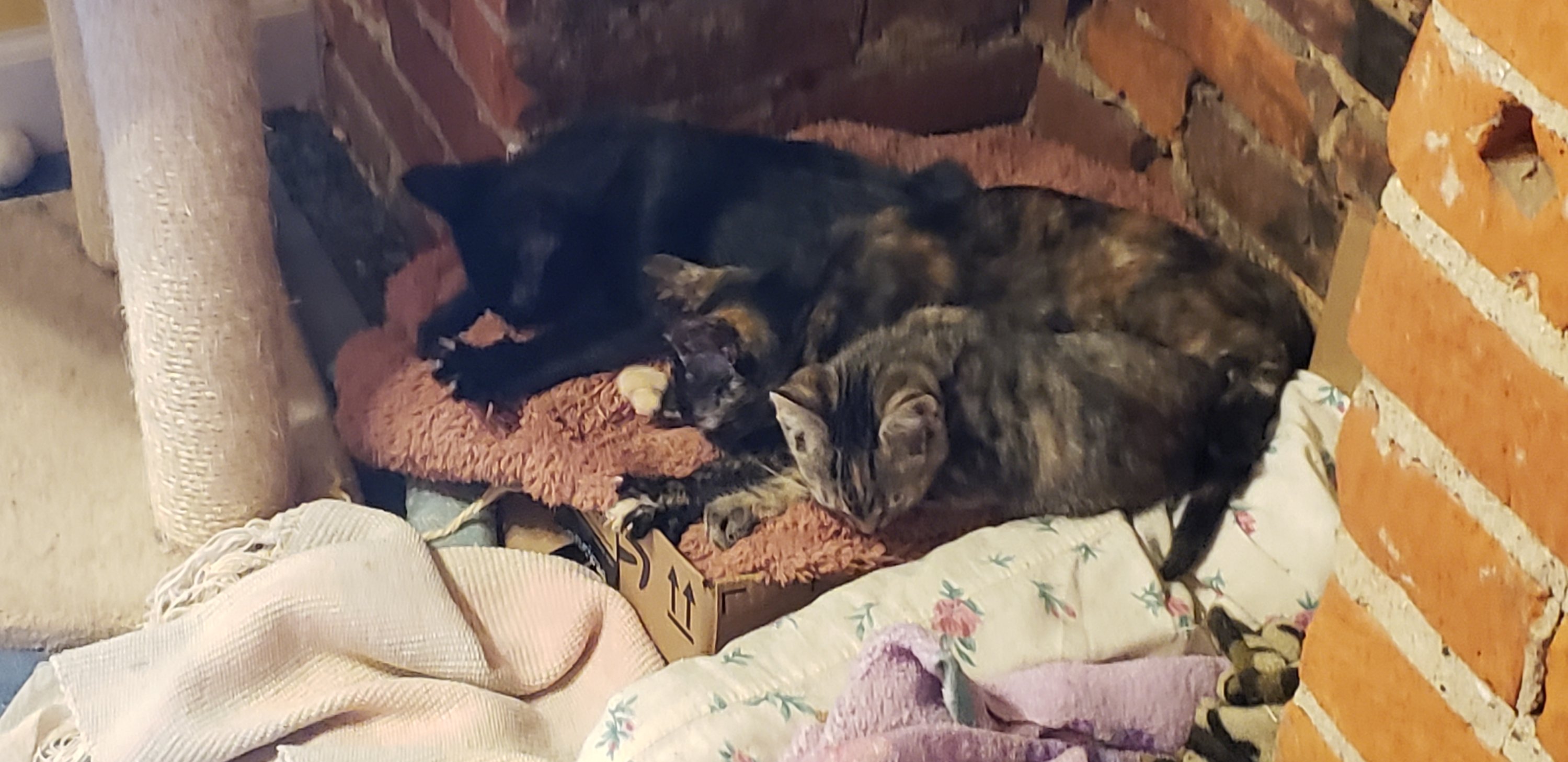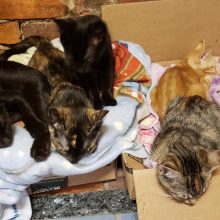 Things quieted down a bit on Saturday as they seemed to mostly sleep off the injection effects. But Sunday, we could notice definite down turn in their exuberance for anything. And we had 4 active vomiters so by the evening, we had to bundle everyone back up and out to Tarentum again where the vet folks were doing other clinical work. They gave another round of injections and determined that Muriel and Furiosa, the two smallest kits, were both dehydrated. Fluids were administered to everyone. Our med instructions were updated and we were sent home with an IV drip to administer ourselves if necessary