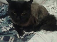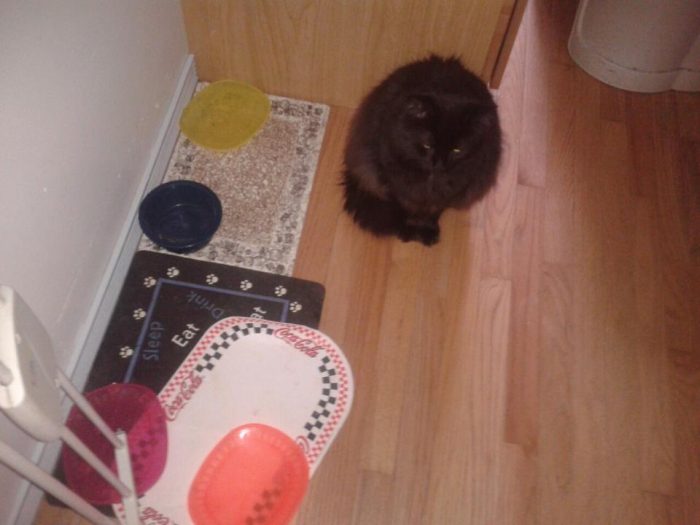He was a scrawny male cat with a gorgeous mane of long black fur and a sweet temperament. I had some chicken in my car, leftover from a drive-thru meal that I had gobbled quickly before my volunteer shift. I put some of the chicken on the ground on a napkin. He sniffed it and stared at me. I pulled the chicken off the bones into small bites and he daintily ate the whole thing. Then when I turned to get more, he jumped into my minivan and settled on the passenger seat with an expectant look on his face.
