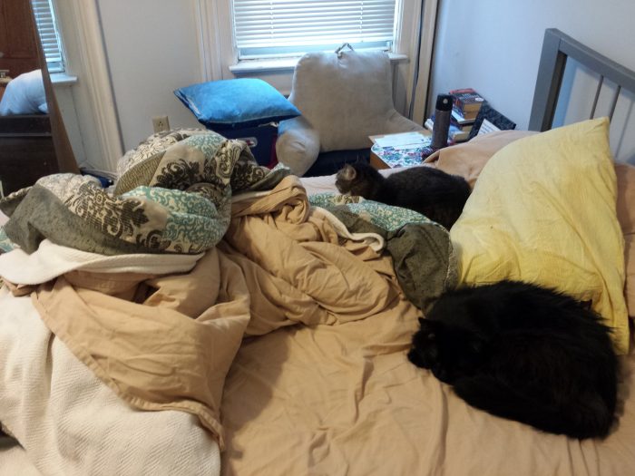 One time, Laura was escorting an inspector around who was assessing the house value for a URA project to do some renovations. The gentleman walked into our bedroom where Simon was going to town with our comforter. He commented “Oh look at the kitty wrestling with the blanket” and kept going. Laura was not thrilled.