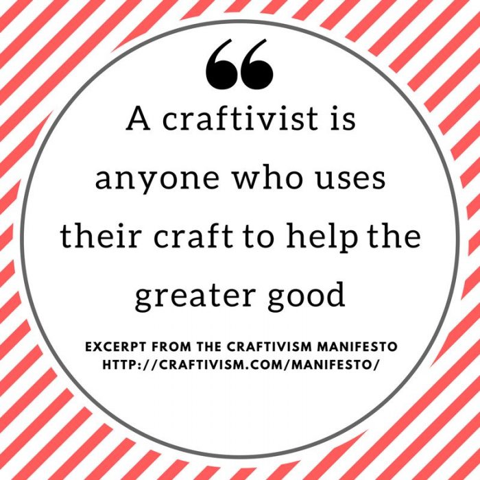 Describe the Craftivist concept – who is a craftivist and what do they do?  The Craftivism Manifesto defines “craftivist” as “anyone who uses their craft to help the greater good.”  In this case, we’re playing host to craftivists who support social, economic, and environmental justice – the progressive end of the greater good.