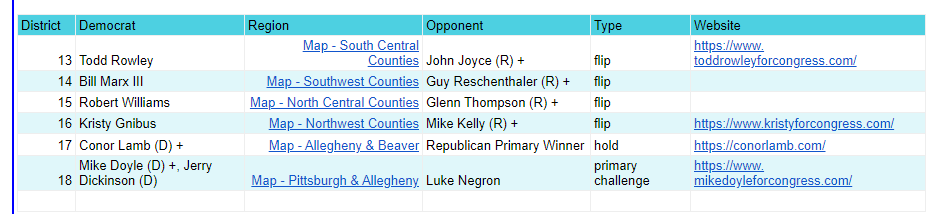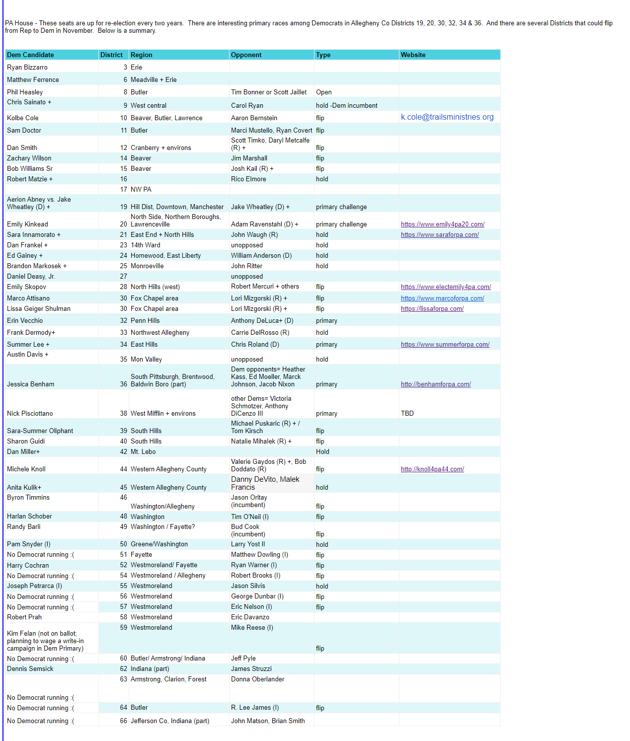 PA House – These seats are up for re-election every two years. There are interesting primary races among Democrats in Allegheny Co Districts 19, 20, 30, 32, 34 & 36. And there are several Districts that could flip from Rep to Dem in November. Below is a summary.