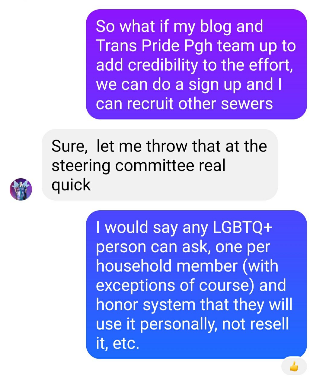 Kerr explains that when she approached potential partners or larger donors, one of their first questions was to identify a specific local incident where a trans or queer person had been denied a mask because of their identity. In spite of the deluge of media coverage of the transphobia targeting Dr. Levine, they were still in disbelief that gender identity or sexual orientation might impact the typical trans and queer person. She points out that in Boyertown, Pennsylvania, cisgender heterosexual students sued their school district to prevent trans students from using bathrooms and locker rooms, trying to get the case in front of the US Supreme Court.