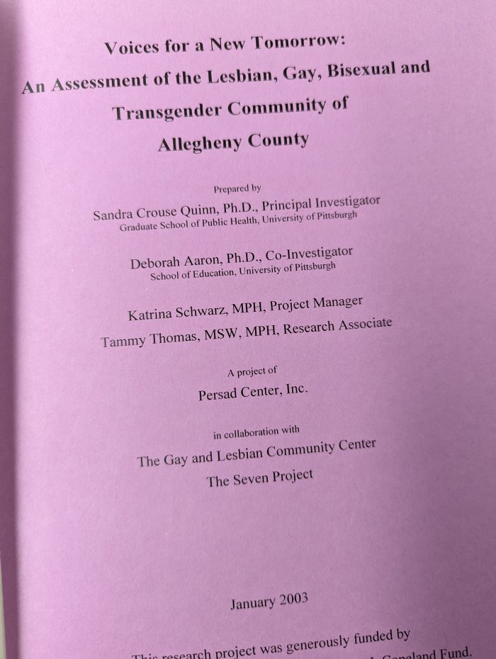 In January 2003, Persad Center published a community needs assessment in conjunction with the Gay and Lesbian Community Center (now the Pittsburgh Equality Center) and The Seven Project. The researchers were Dr. Sandra Quinn and Dr. Deb Aaron, both of the University of Pittsburgh.