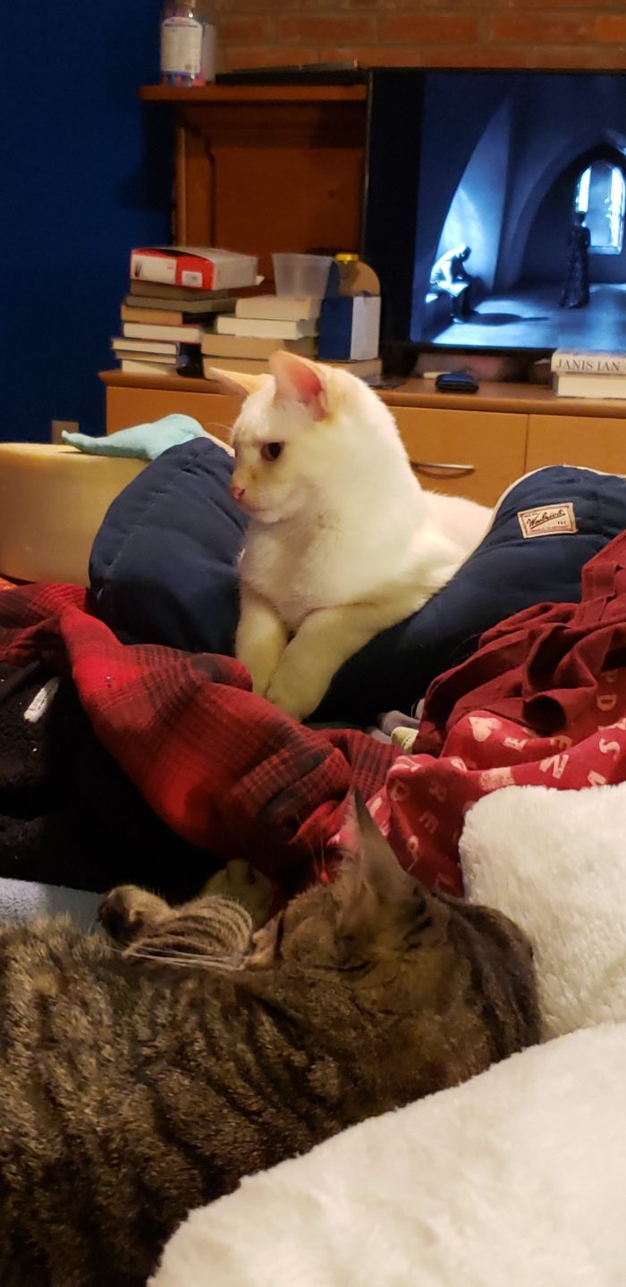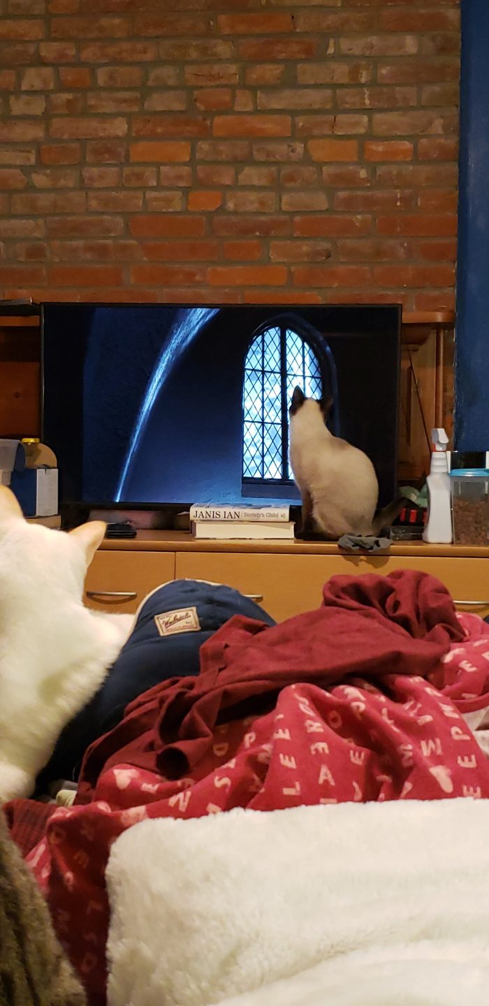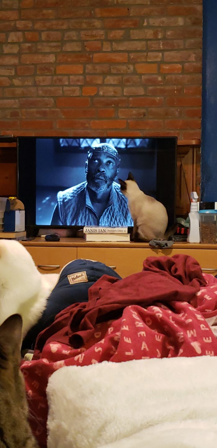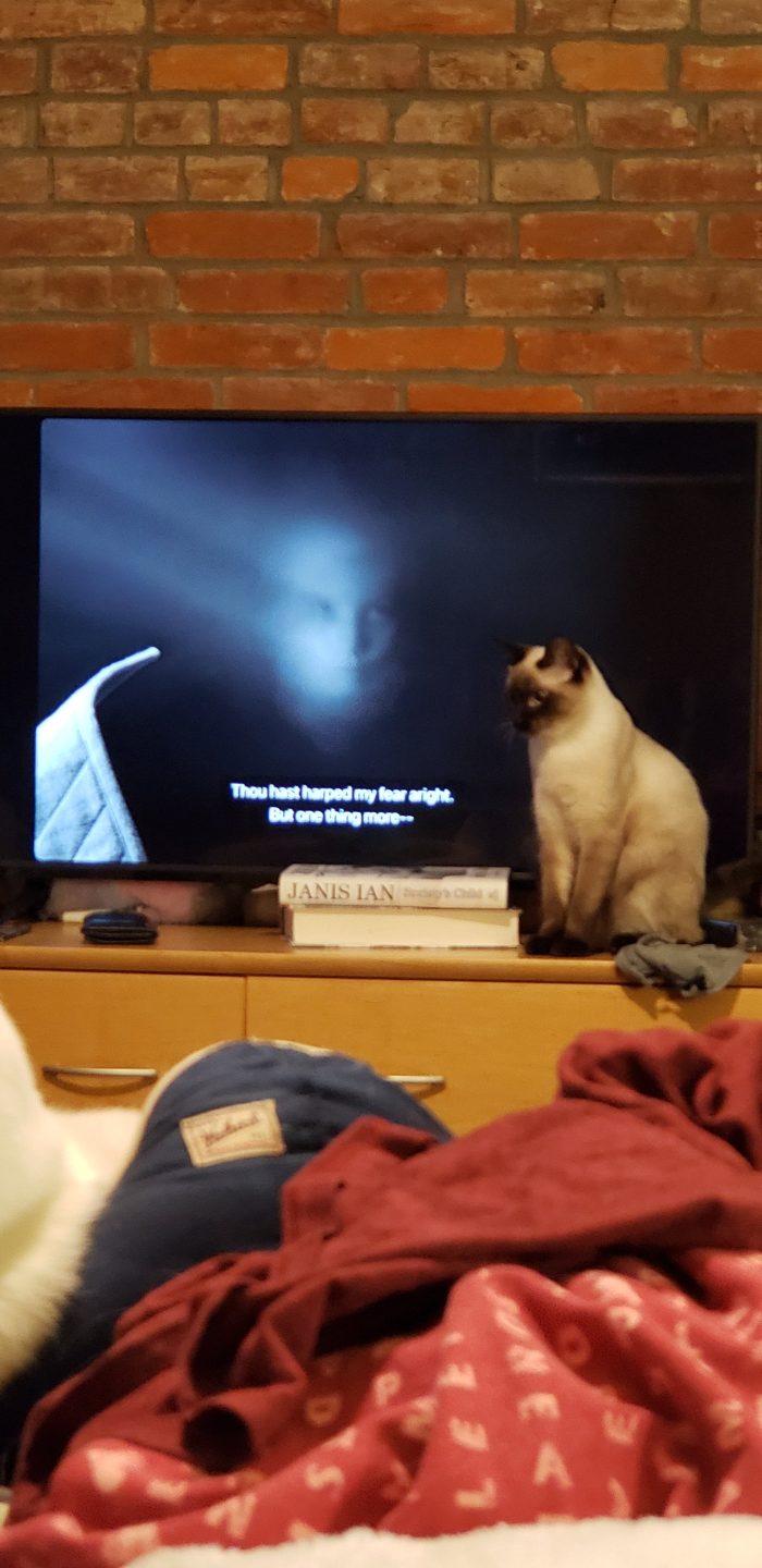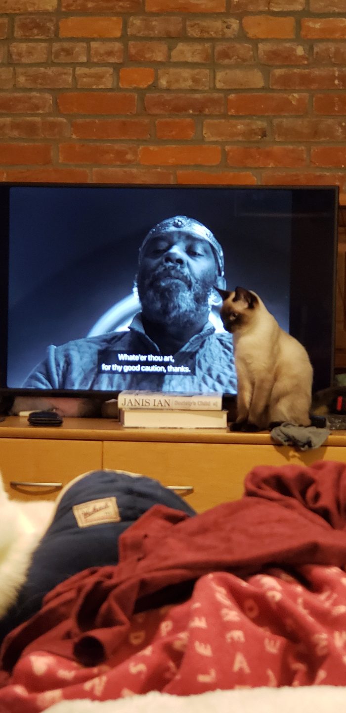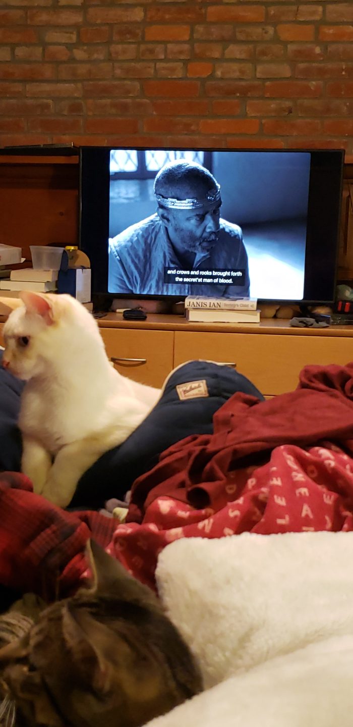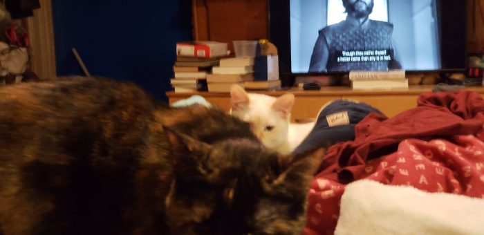 I can’t recall the last time I watched a performance of MacBeth and Laura has never seen it before so this was a good way to spend our Saturday evening. With cats. Sharing the screen are some of our foster kittens and some of our resident critters.