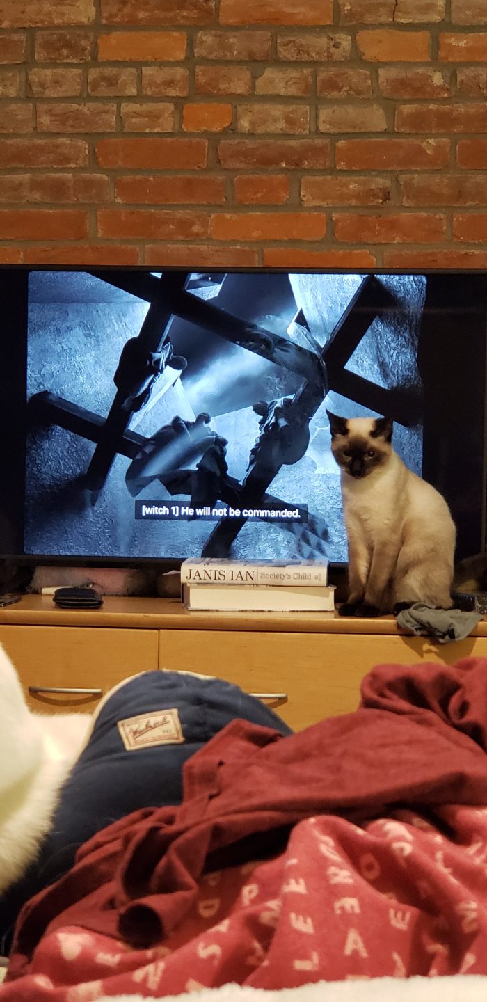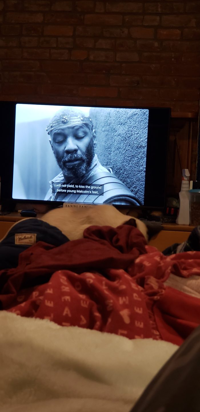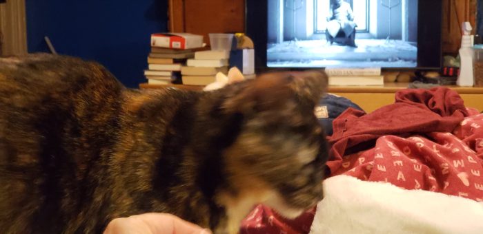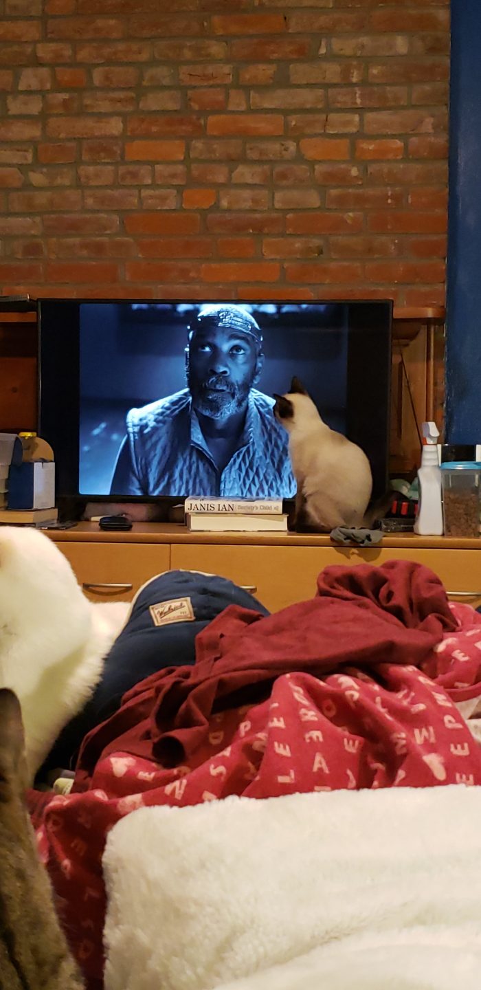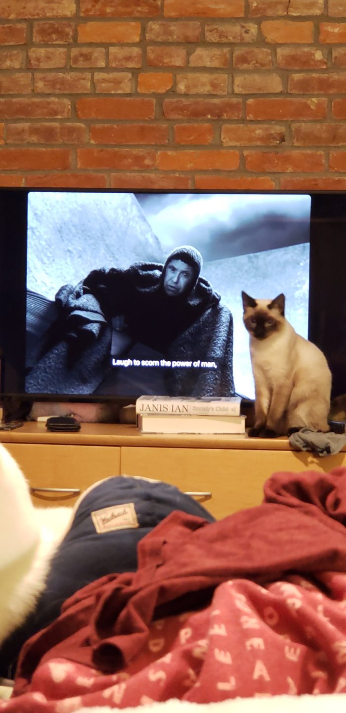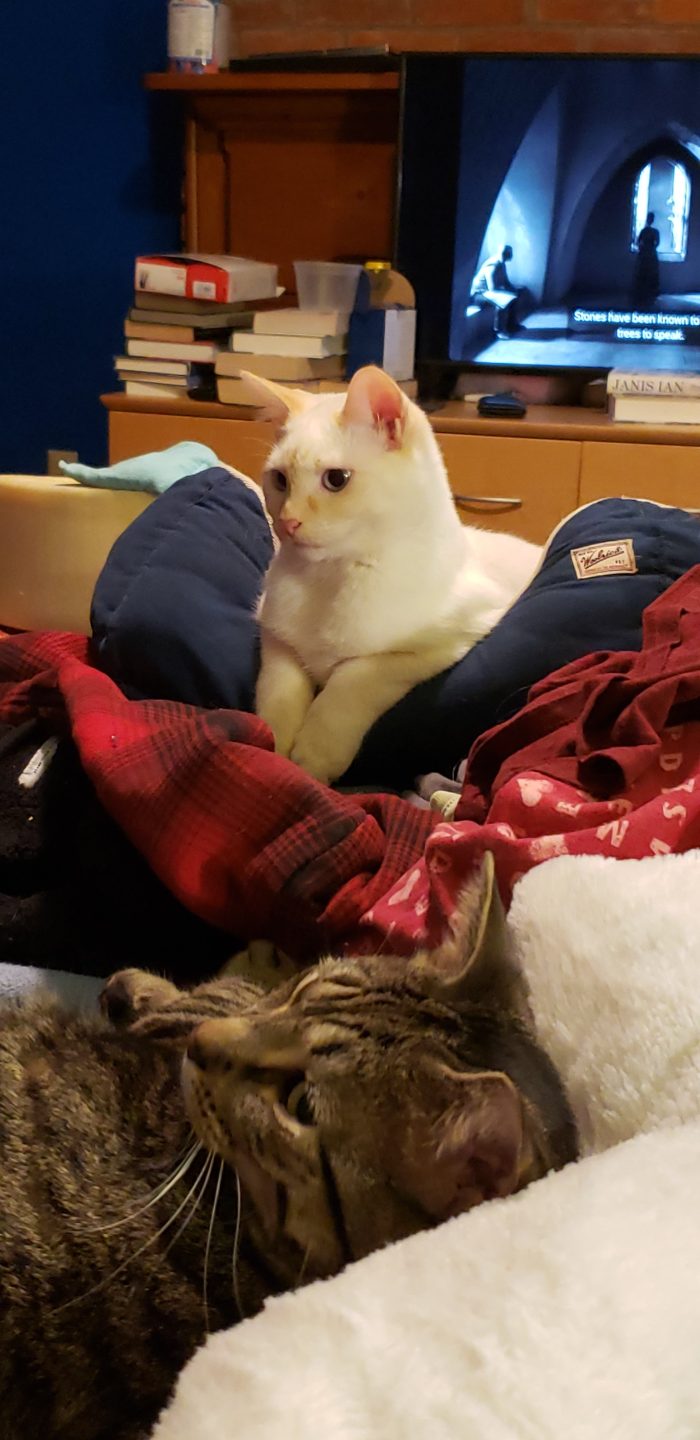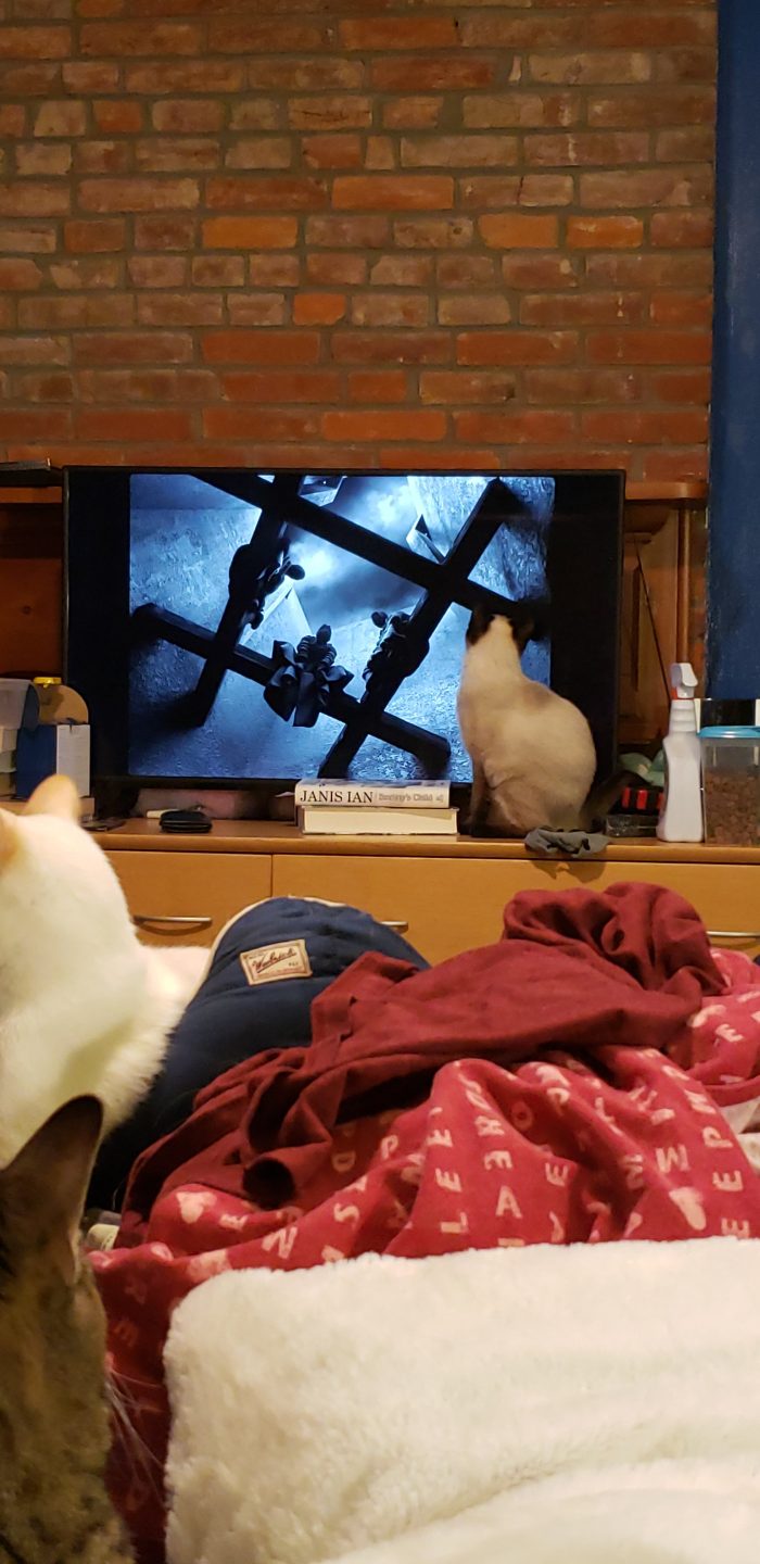 I can’t recall the last time I watched a performance of MacBeth and Laura has never seen it before so this was a good way to spend our Saturday evening. With cats. Sharing the screen are some of our foster kittens and some of our resident critters.
