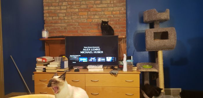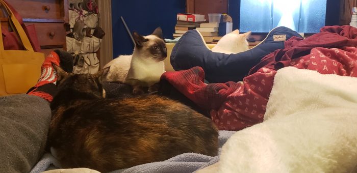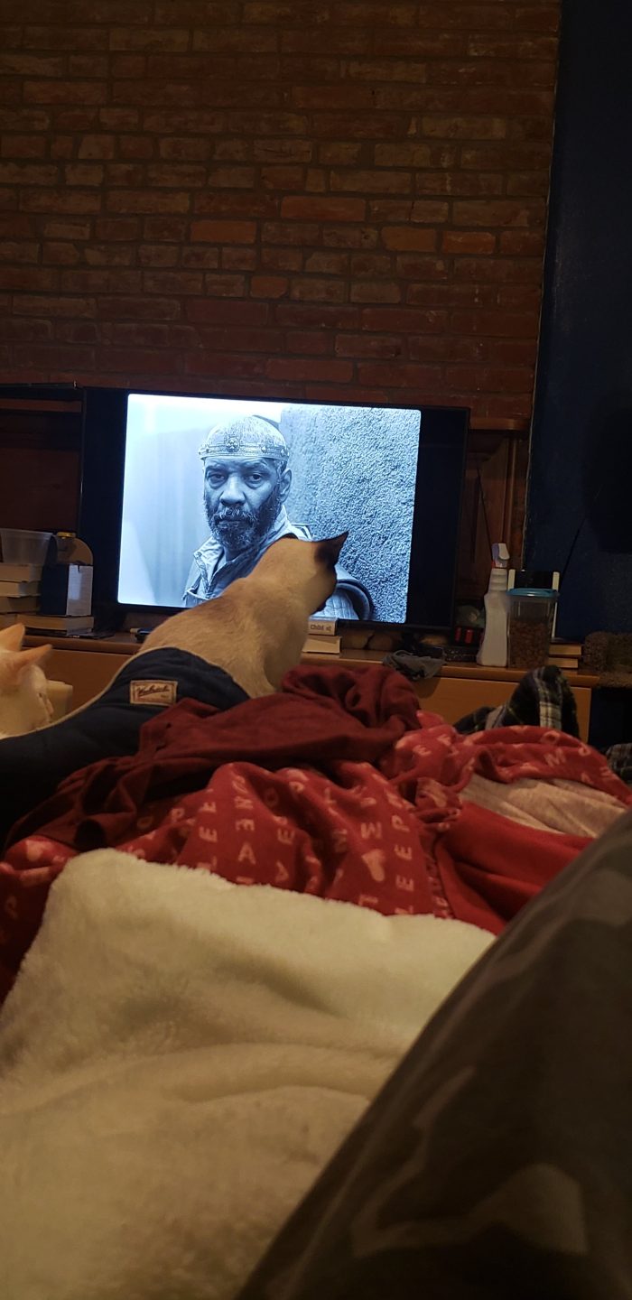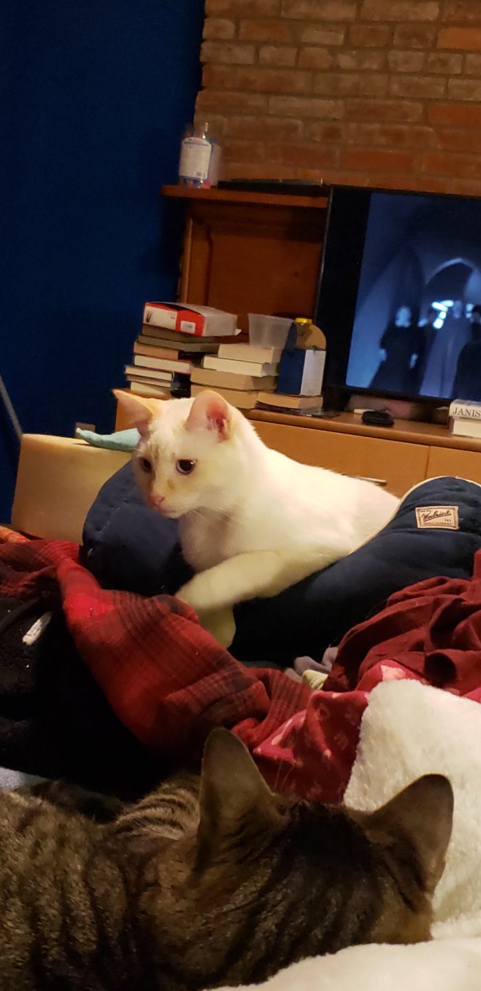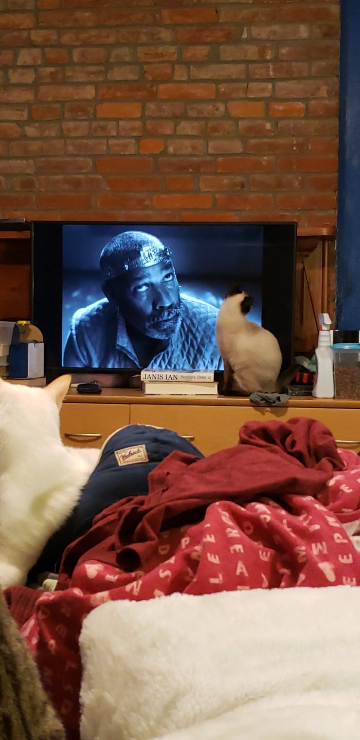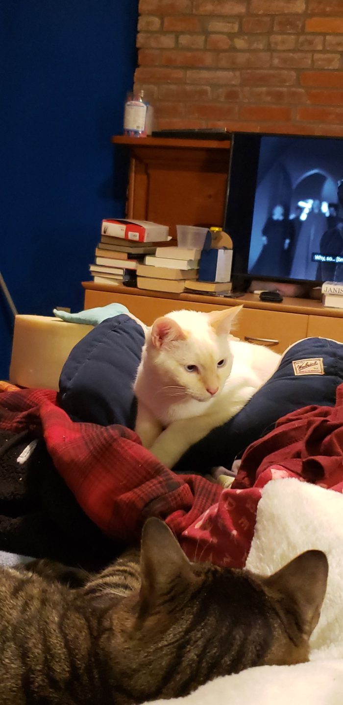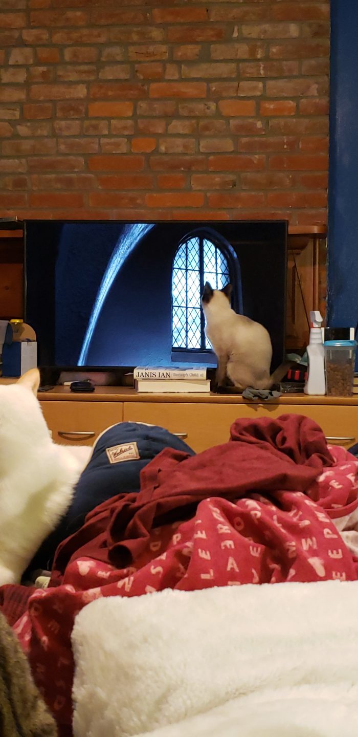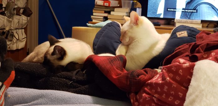 I can’t recall the last time I watched a performance of MacBeth and Laura has never seen it before so this was a good way to spend our Saturday evening. With cats. Sharing the screen are some of our foster kittens and some of our resident critters.