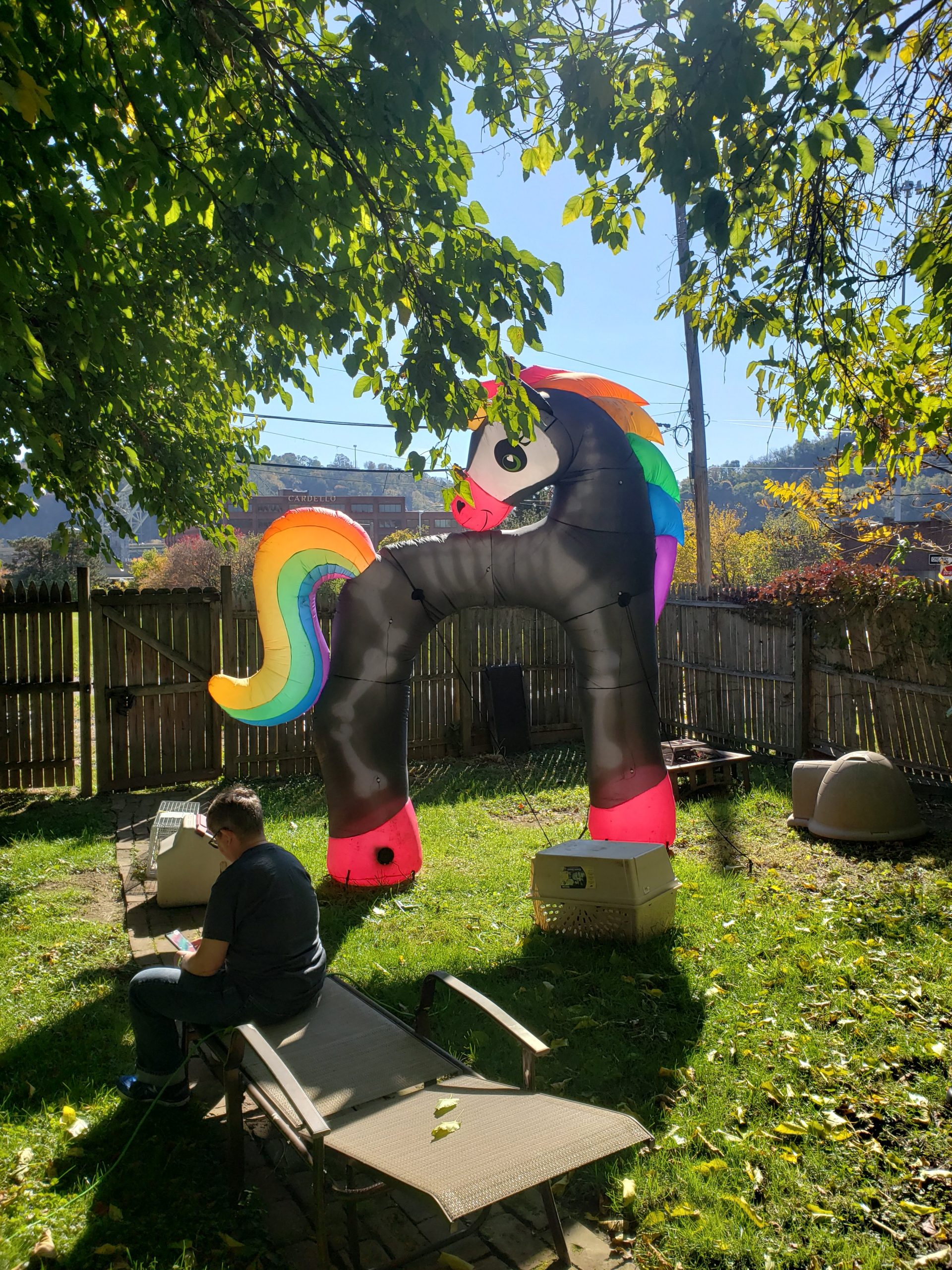 First, the inflatables. Over the years, I have acquired a green Christmas tree, a very large owl (named Xavier) and a skeleton unicorn (named Calliope) For Halloween, I have Xavier and Calliope up. I’m not a monster – the tree will go up on November 1. Between these critters and the heated cat beds and the heated water bowl, the backyard is a veritable web of extension cords.