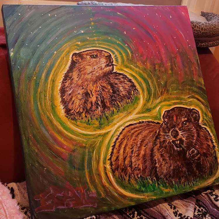 And we have this Kai Devenitch original artwork to commemorate all of it. I think of this painting each time I see our local groundhogs heading for our cat food feeding station. They know we take good care of them.