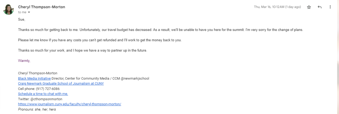 I understand that small organizations have tight budgets, but unless they want a nonstop train of rich folx shaping their organization, they need to figure things out. As for CUNY, they just received $750k grant to address bigotry. They couldn’t find the funds for my little trip?