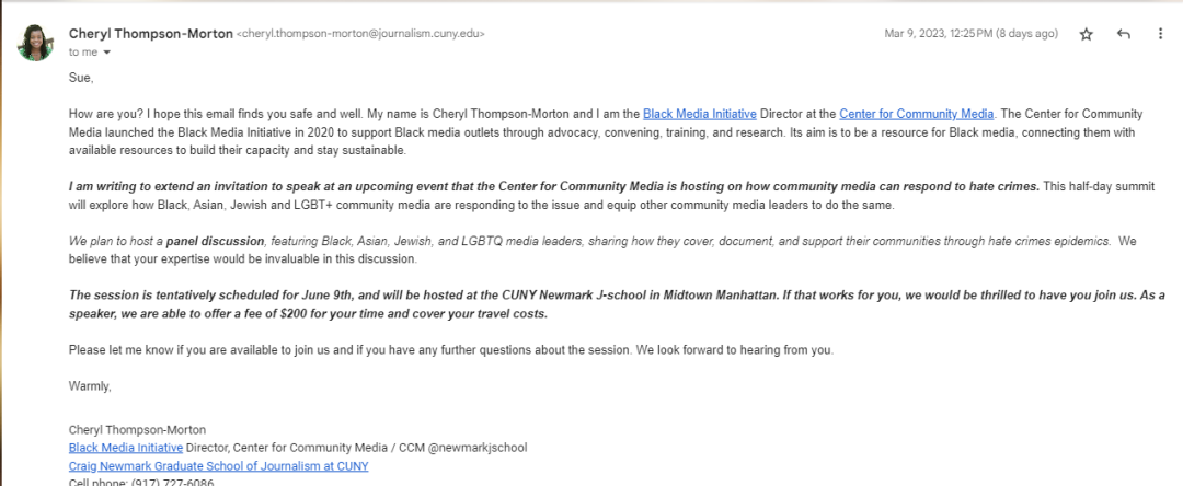 Recently, The City University of New York Center for Community Media invited me to speak at a summit on hate crimes & media, covering my expenses & a $200 stipend. I booked train, planning on using the stipend to cover my wife’s ticket. I told them I would be doing this.
