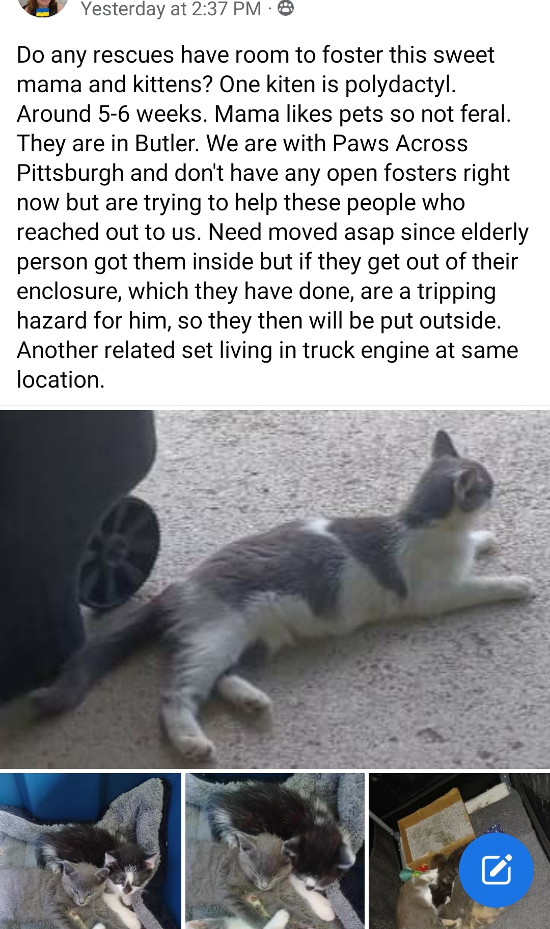 Kitten season has hit hard this year and the caretakers need your help. From finding a very small one with a potentially broken paw in the middle of Federal Street to pleas for help with large litters in Uniontown and beyond, everyone is overextended and running in three directions at once. With a kitten in each hand. #PghPetFolx is here to help with a Kitten Baby Shower.