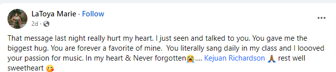 But Amiri and KeJuan were in a car, not a school. They were both shot multiple times by another driver. There’s nothing romantic or comforting that they died together. They were shot, wrecked their car, probably dazed and scared and maybe knowing they were going to die. One hopes people find small comforts in these moments to ease their fear. But that’s more likely to comfort us.