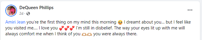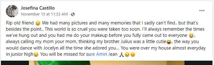 Amiri Jean Richardson was also 21 and identified as a Black trans woman. Amari had a ribald sense of humor enjoying word play and a positive . She also shared experiences of transphobia in her social media feed. She followed boxing and popular musicians.