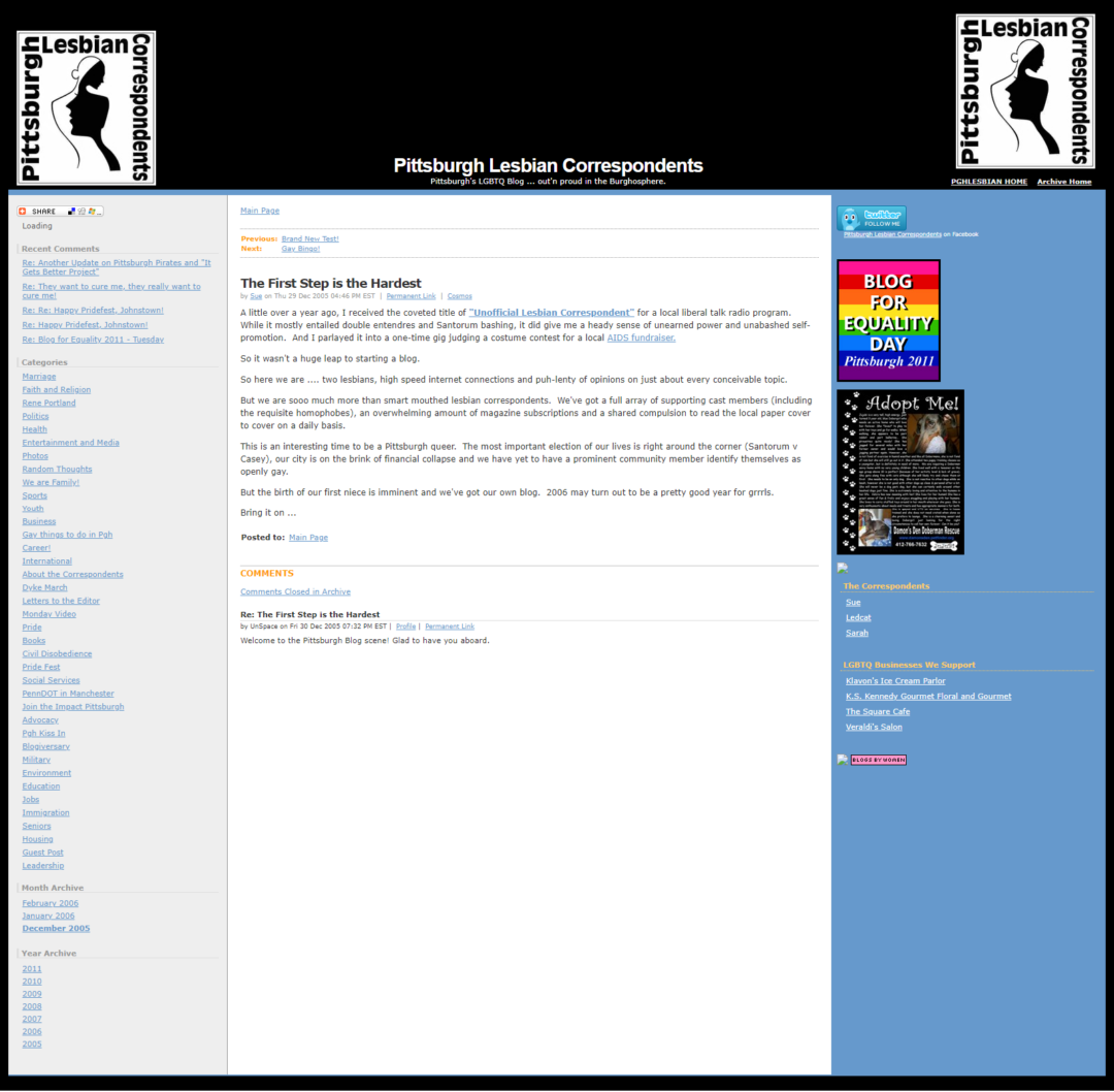 Pittsburgh Lesbian Correspondents faced a daunting stumbling block earlier in 2023 when Kerr had to give serious consideration to selling the blog to finance unexpected legal battles around her civil rights. Supporters came to her rescue, but the blog’s longevity relies on future investors, as does the preservation of Pittsburgh Lesbian Correspondents’ archives.