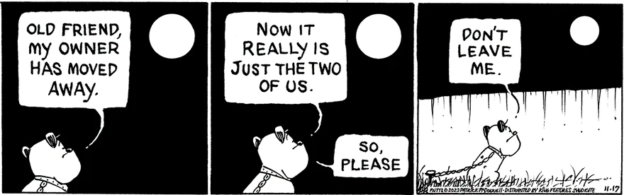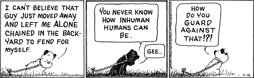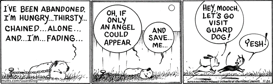 I’ve been following the comic strip Mutts. The creator has decided to set free Guard Dog, a supporting character who has been chained out back by his owners since 1995. It’s a heart wrenching story. His owners moved away and left him chained alone in the backyard. He withered. Earl and Mooch found him, got the attention of neighbor girl Doozy who in turn sent Earl to get his human, Ozzy. Go, Guard Dog.