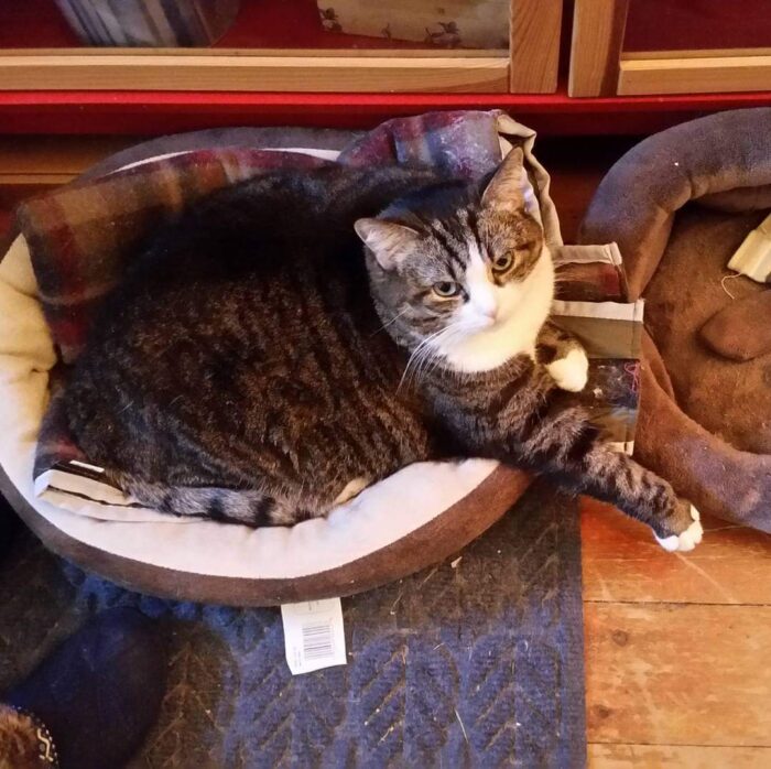 Many of the other cats have come to see her. Precious has been a nurturing grandma to some, especially Muriel, Molly, and Kinzua. Kinzua has been in here often, curling around her to offer comfort perhaps. Our other Grandma, Coco, comes in quite a bit.