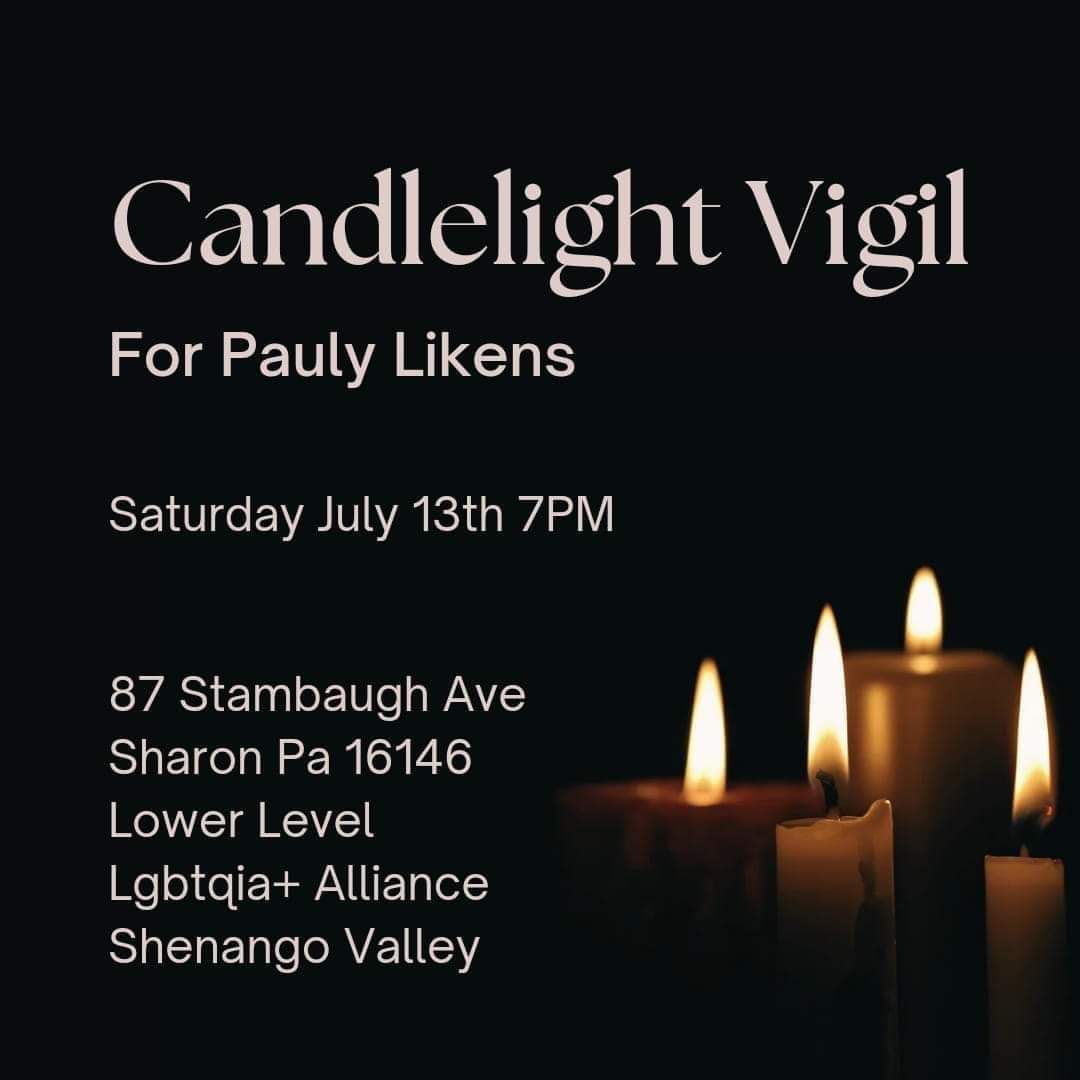 The Shenango Valley Pride Picnic and LGBTQIA+ Alliance Support Groups will hold a candlelight vigil on Saturday, July 13, 2024 in Sharon.