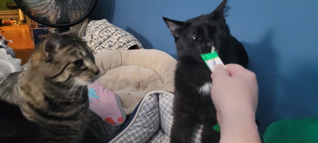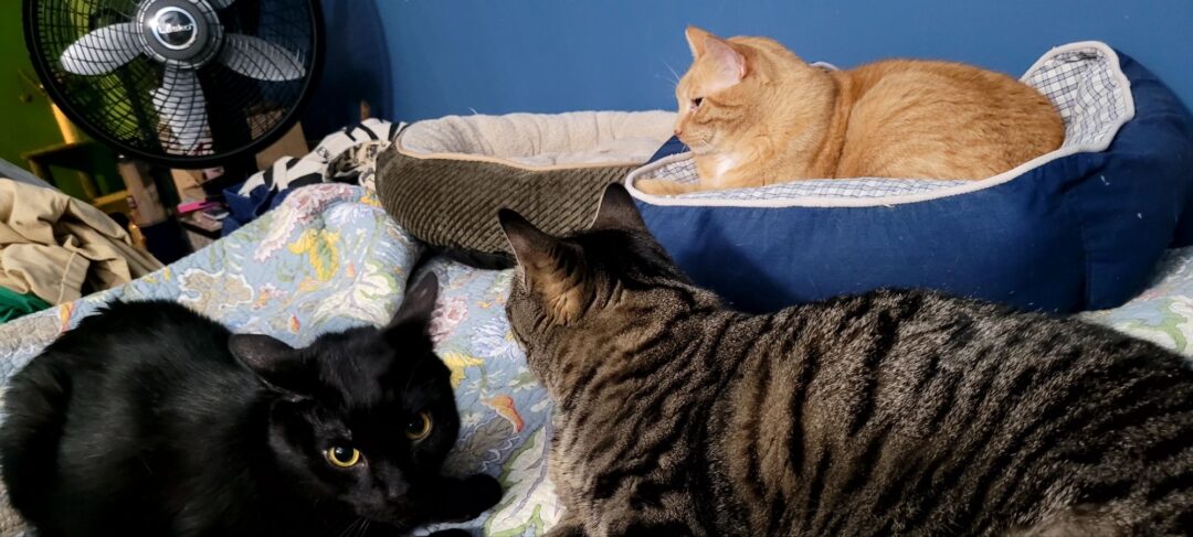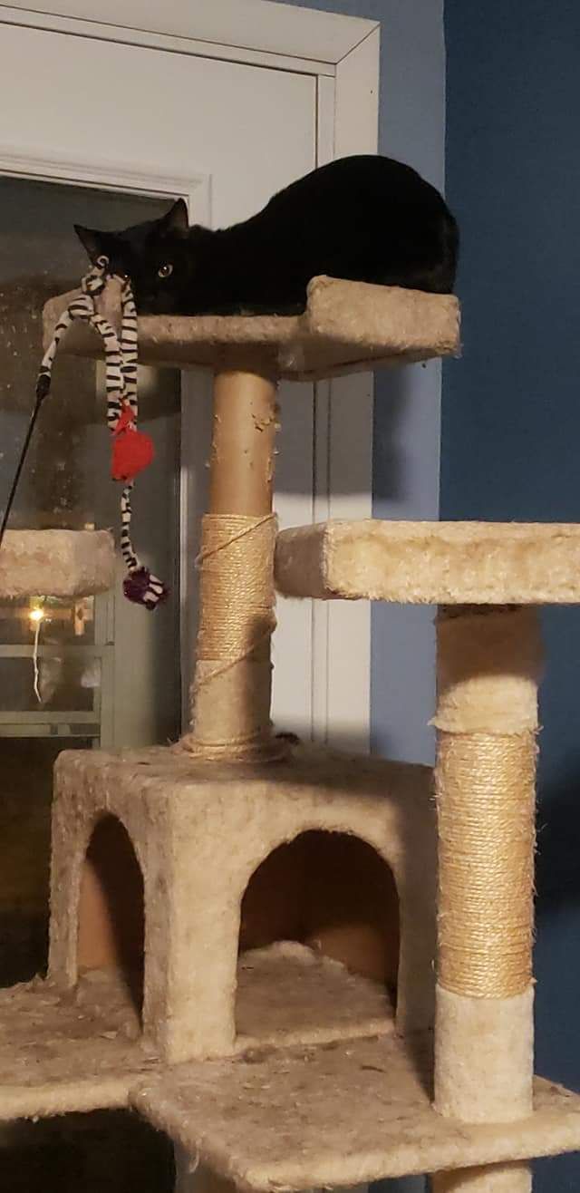 When I returned home in March 2024, I incorporated behavior tools – pheromone sprays. Interactive games. More trees. More scratching posts. Water fountains. Play time every day with my narration.