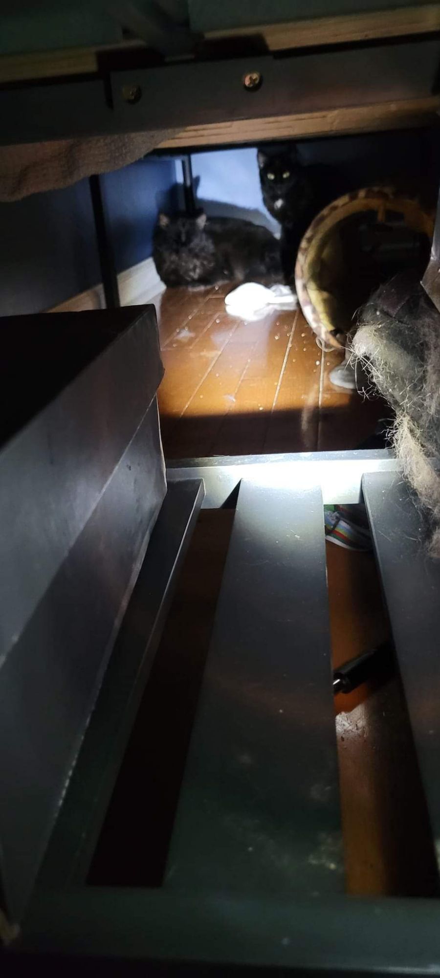 I put a cat bed and a fabric tunnel under my bed. There are multiple entrances and exits. Every afternoon is snacktime under the bed and in the attic.