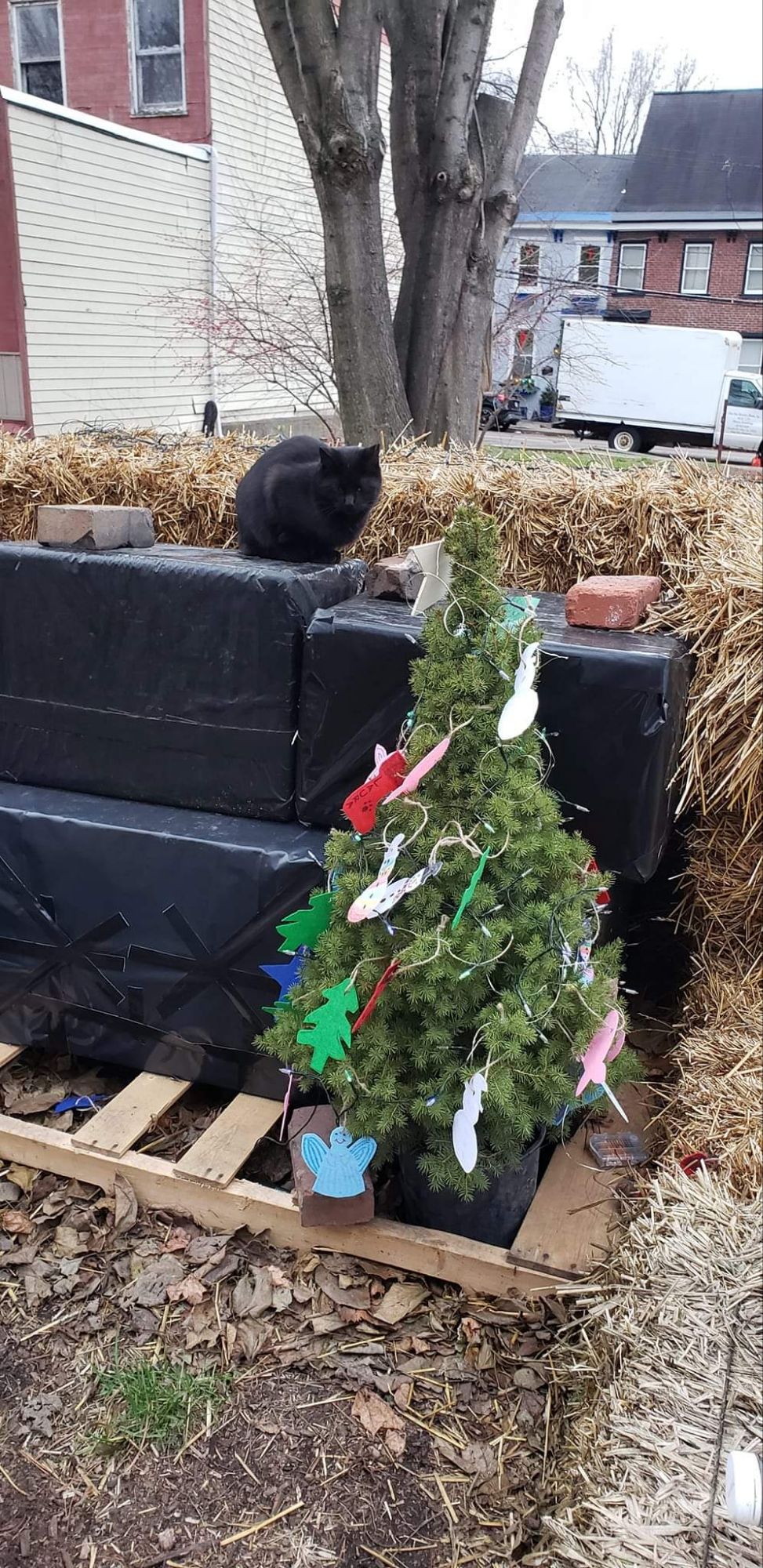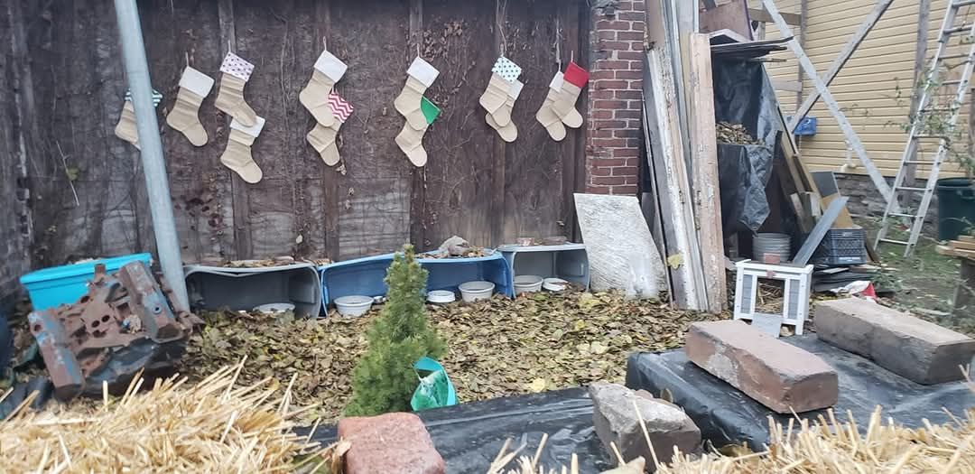 In 2021, I decorated Fort Faulsey to celebrate the holidays. Everyone thoughts I was ridiculous – I ordered solar powered lights, stockings, bought a tree. Somewhere I have photos of the community cats staring at the lights. Marie and I made a plan too it again.