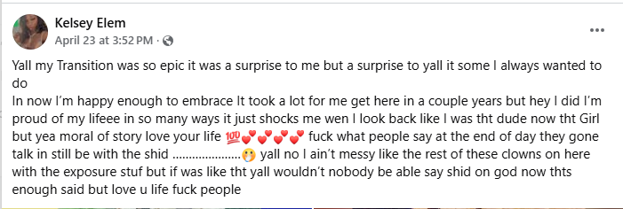 Yall my Transition was so epic it was a surprise to me but a surprise to yall it some I always wanted to do In now I’m happy enough to embrace It took a lot for me get here in a couple years but hey I did I’m proud of my lifeee in so many ways it just shocks me wen I look back like I was tht dude now tht Girl but yea moral of story love your life ![]()