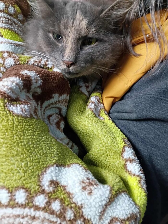 Charlotte got very ill recently and her attentive caretaker noticed. Charlotte allowed herself to be taken into the house. The caretaker called us, her contacts at the pet food pantry. We rushed over, put her in a carrier, and took her to River Urgent Care in Brookline. We waited nearly two hours, but Charlotte was calm. When released from her carrier, she turned out to be this amazing love bug – she purred and wanted to be held and demanded pets. We were all shocked. The vet immediately said she had at some point been someone’s pet. Sigh. She was a pet and then homeless for three years, afraid to go inside.