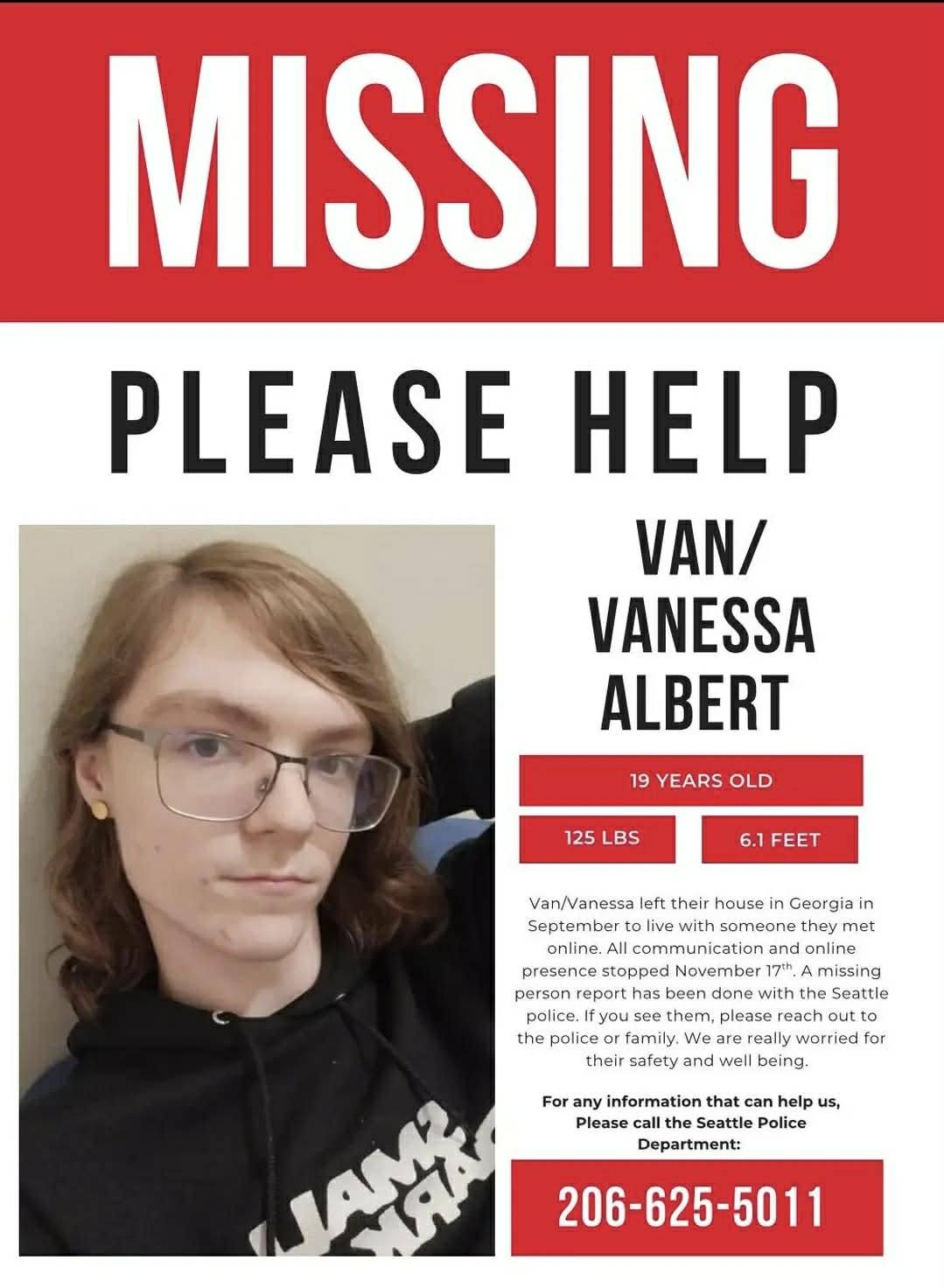 Once again we come to you for help in finding Van. The last email I received was November 15th, and the last online presence shared was on November 17th. The person who paid for them to come out to Seattle has also put in a missing person report and has not heard from Van at all. I’ve been in contact with the Seattle Police Department many times, and they have found no leads to where they could be at this time. Van is autistic, struggles with mental health, and has been off medication for over a month. If you know people in the Seattle area, please share with them. We are desperately trying to find Van. We are worried about their well-being and safety. In Seattle they may mainly go by Vanessa or Nessa. This is the last picture they shared on November 17th. The case number is 25-354954.