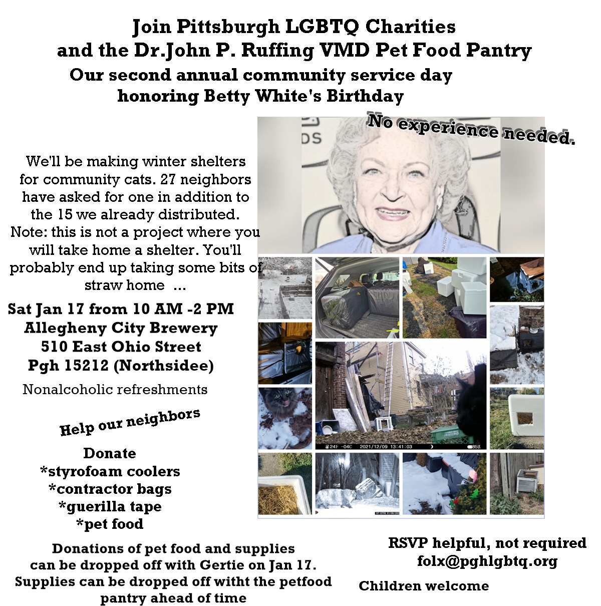Why winter shelters? Winter shelters are vital for community cats. A safe warm place to get out of the elements is a fundamental tool to manage a cat colony. A simple version made from a sturdy Styrofoam cooler, a contractor bag, tape, then stuffed with straw (not hay) is quite effective. Our focus is on … Continue reading Pet Food Pantry, Allegheny City Brewery Host Winter Cat Shelter Community Service Event