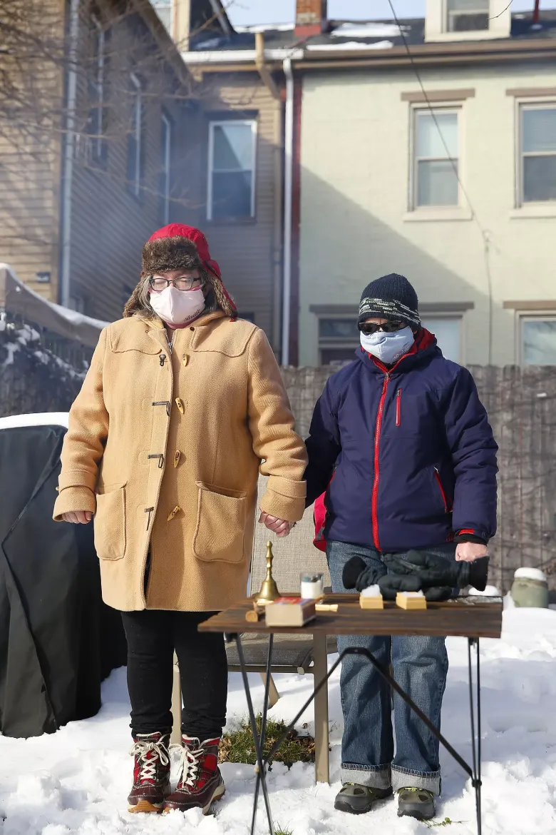 Scenes from a longterm Pittsburgh couple’s backyard pandemic wedding – February 2021. This is bittersweet for reasons you already know, but still a favorite. Our wedding was very simple with a few last minute changes, but I wanted to preserve it. I needed a photographer who could deal with COVID restrictions. I called Jared Wickerham and asked to hire him for the gig. He said “I’ll call you back” and when he did, he proposed a photo feature for the CP, “good news” he said. My then-partner agreed. He was great, unobtrusive, prepared to do the individual groupings minus in laws or ex laws. And it was like being in the City Paper Society Pages, had such a section existed. Jared very graciously released the photos to me.