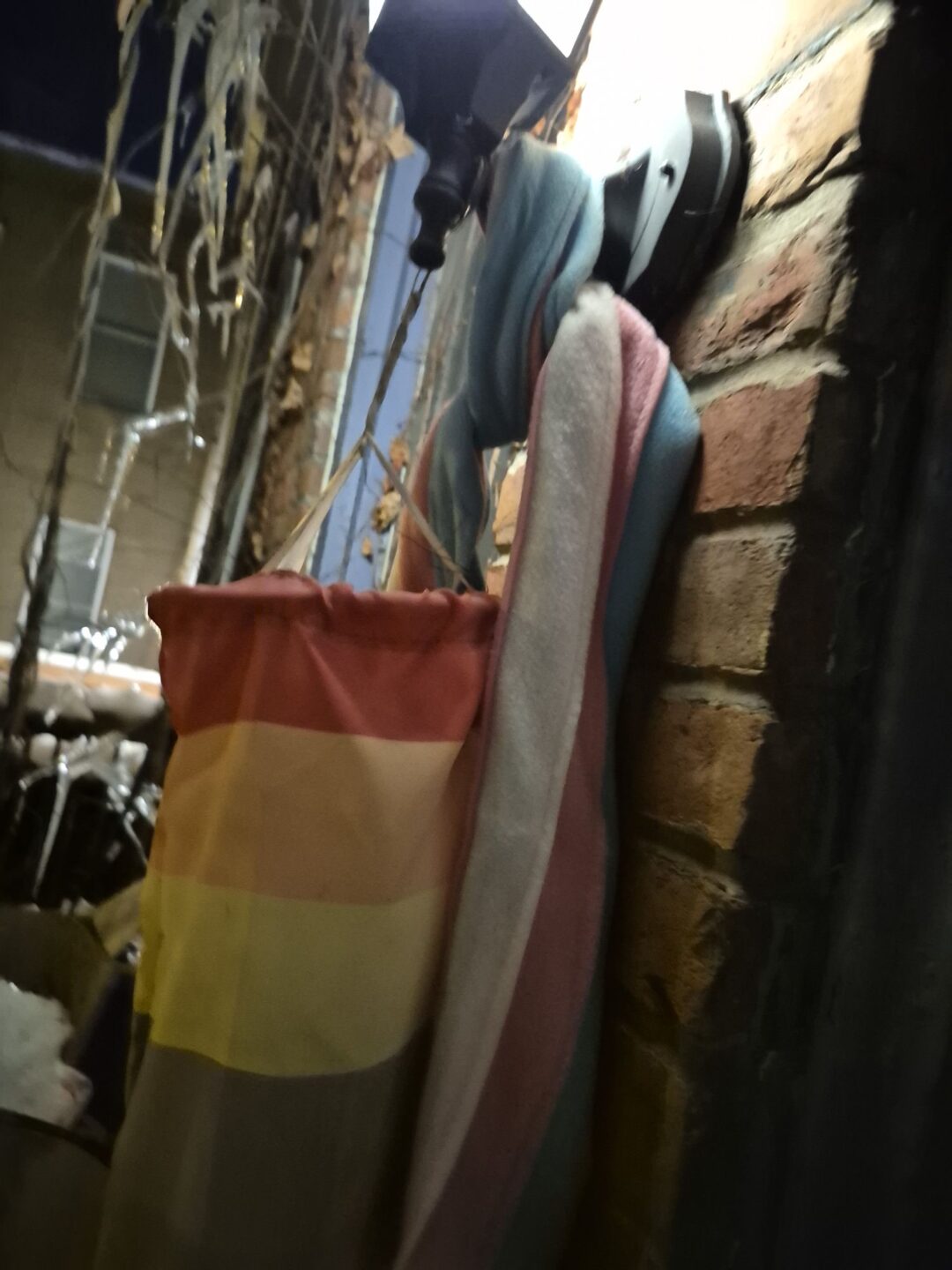I bought this scarf from a trans creator about four years ago. It is too short for me to use in a hard core way, more of a gentle reminder that my protection is wrapped up in protection of the trans community. You might notice a rainbow lantern, very tattered from 20+ years of hanging outside.