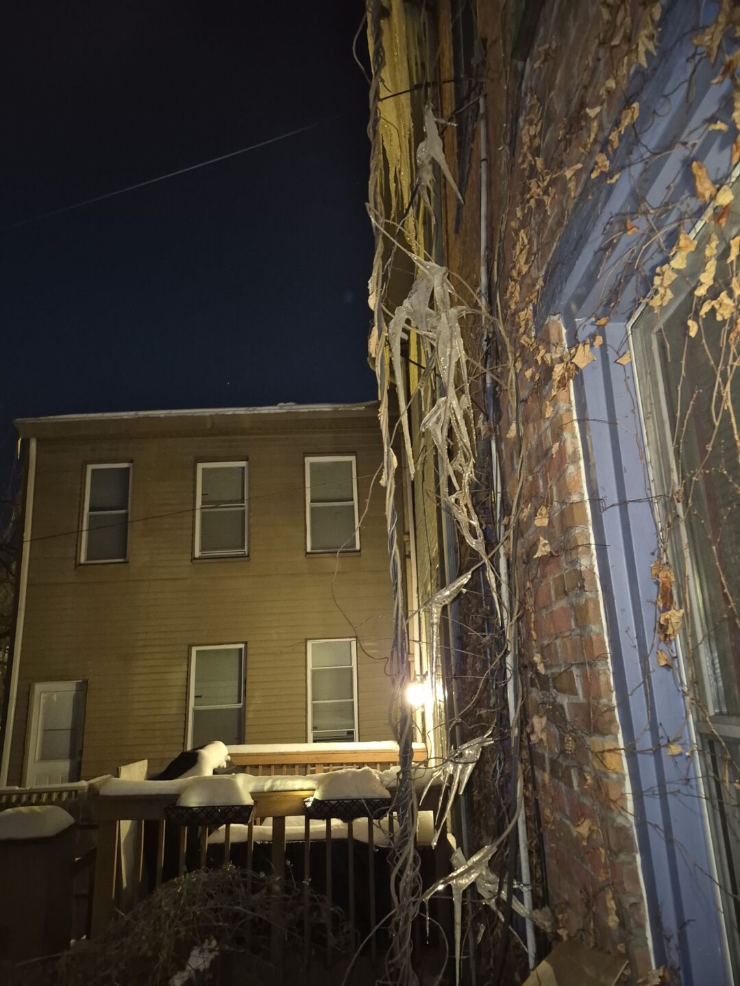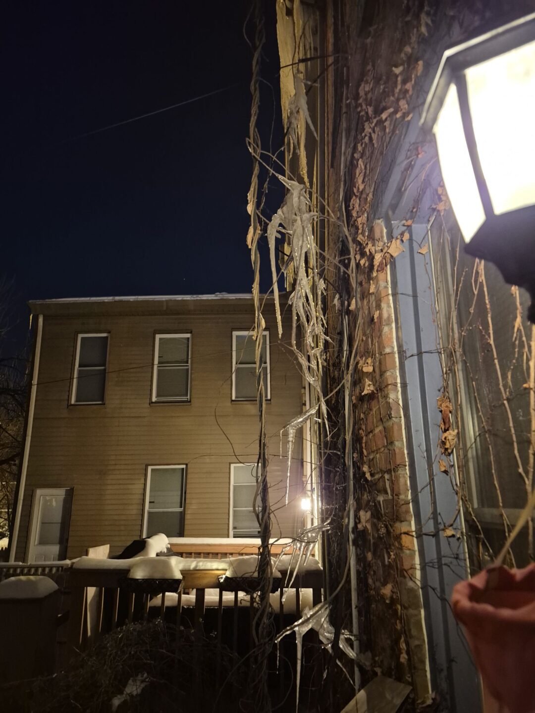 That’s when I saw this ghastly, mesmerizing ice sculpture working its way down the wires and vines attached the house. We can use all the blessings anyone sees fit to cast upon us after this entrance to 2026 – two thefts from the pet food pantry, a blizzard that’s been unrelenting, court drama, and unceasing weekly visits to the veterinarian with different cats.
