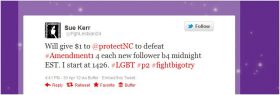 Read all about the effort on Bilerico For each new Twitter follower I pick up today by midnight, I will donate $1 to fight Amendment 1 in North Carolina. Amendment 1 is a “marriage protection amendment” … let’s support families in North Carolina! Click here to follow me! I’m @PghLesbian24
