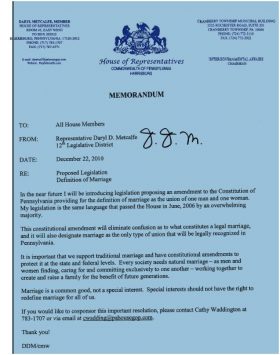 From Equality PA — Friends: Let the crazy begin. Hopefully, this won't ruin anyone's holidays but it appears from the attached memo that the battle will begin early in 2011. What I am providing is a copy of a memo from one of our chief opponents, Rep. Darryl Metcalfe, calling on his legislative colleagues to sign on […]
