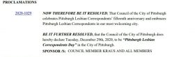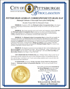 Mayoral City of Pittsburgh Proclamation that Tuesday, December 29, 2020 is ‘Pittsburgh Lesbian Correspondents Day’ in Pittsburgh